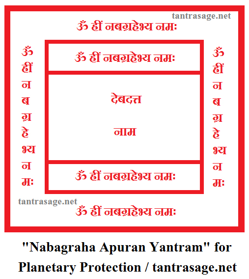 The user will wear clean White dresses, faced towards North direction on a clean mattress, and draw the first “Nabagraha Apuran Yantram”, and Strong Nabagraha Mantra and his or her name,with Astagandha ink, the Yantram will draw with a pointed wooden stick of Dalim or Pomegranate,and also write the name of that person, who is facing problems, on a Bhooj Patra.