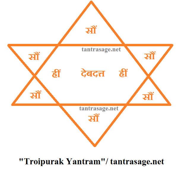 After making the Yantram, the user will energize the Yantram with some holy perfume, some scented flowers, Astagandha powder, dust Kum Kum, Sandal wood powder or paste, some burning incense sticks, some sweets, some white rice, some money. The Mantra will chant 108 times upon the Yantram, when the user will chant the Mantra, he or she will touch the Yantram, with his or her middle finger of his or her right hand. Then the user will put this Yantram, in a 100 gm bottle of pure cow Ghee. Everyday the user will chant the Mantra for getting blessings of Devi Tripura obviously.
