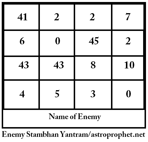 When an enemy creates disturbance in our life, we are become hopeless and try to overcome that situation as soon as possible. In this article, I am describing about a powerful Enemy Stambhan ( Stopping Action ) Yantram, which will blunt all motivation of the enemy, who try to harm us, with his bad motive. This Enemy Stambhan Yantram will establish an unique protection circle and protect us from any harmful effects, created by enemies.